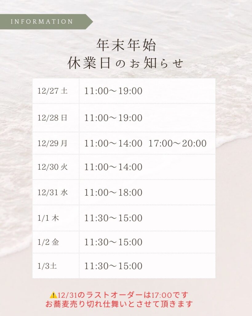 2025年12月27日~26年1月3日までの営業のご案内です。